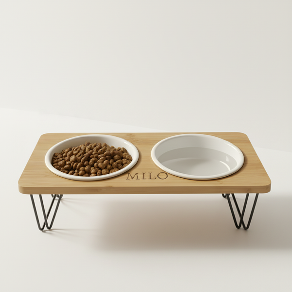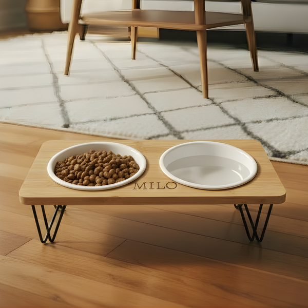 Personalized Elevated Pet Bowl with Laser Engraved Bamboo. Great for cats or small dogs