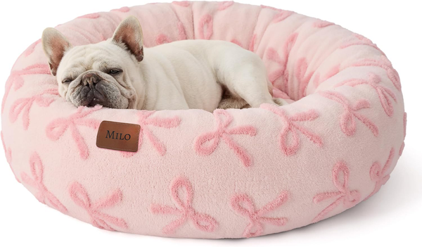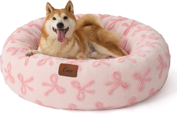 Personalized plush pink bow pet bed, Donut style cat and dog bed